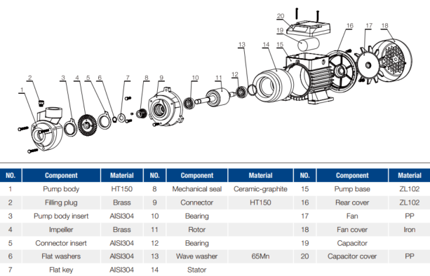 Impeller: Brass/stainless steel (high efficiency and corrosion resistance)