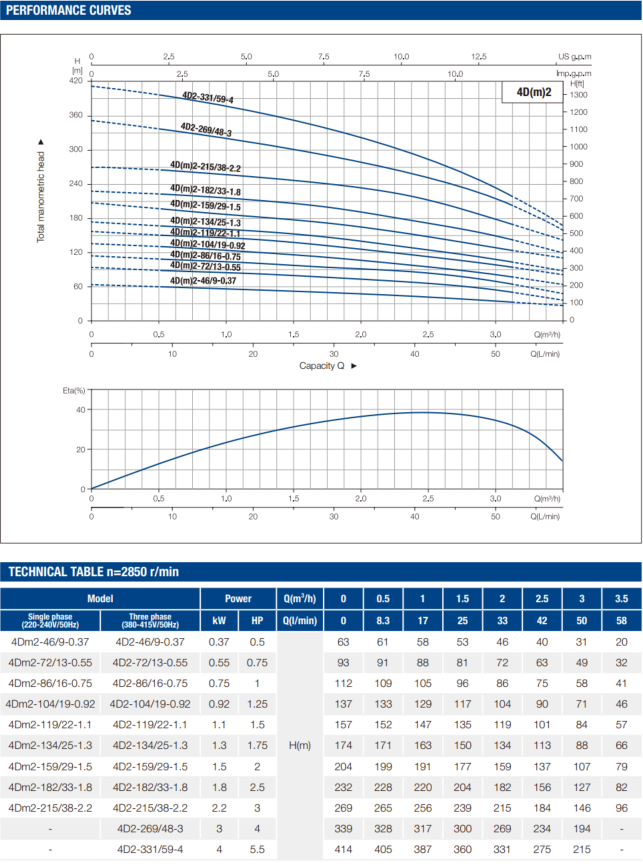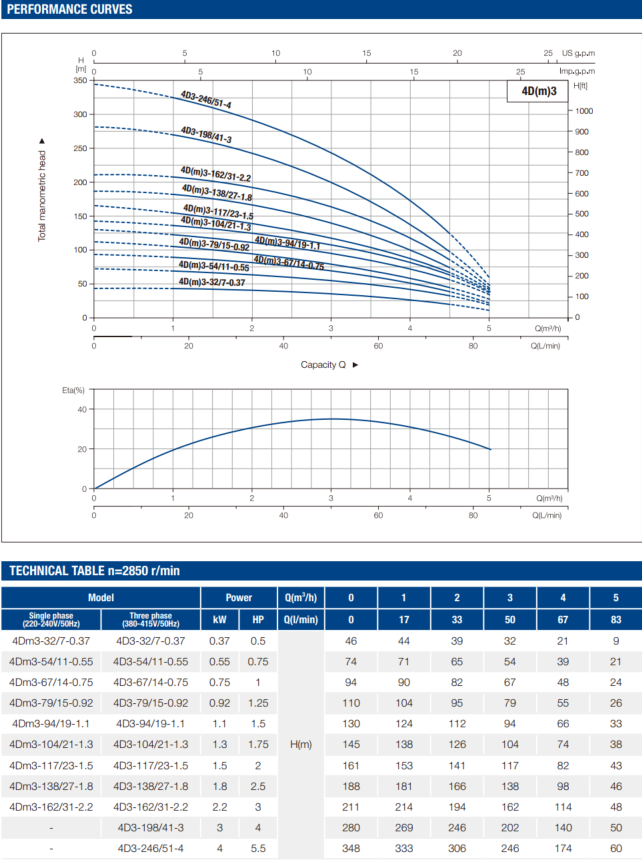 DAYUAN 4Dm2/ 4Dm3 Borehole Pumps from 0.37-4Kw/ Max. flow 5m³/h, Max. head 414m, Price from